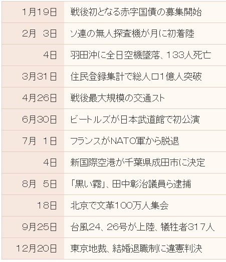 1966年クイズ 年クイズ 2024.09.082025.05.06 1966年クイズで振り返る「あのころ」は、その年の出来事、流行、政治・経済、スポーツ、ヒットしたアニメ、歌謡曲、映画などを題材にしたクイズを一気にすべてを出題します 1966年 出来事 1966年(昭和41年)に起きた出来事はどれ? ビートルズが日本武道館で初公演 天覧試合で長嶋茂雄がサヨナラ弾 国内最大規模の黒部ダムが完成 1966年 出来事 あなたの成績 {{maxScore}}問中 、{{userScore}}問正解 {{title}} {{image}} {{content}} 1966年(昭和41年)経済&物価 1.日経平均株価 / 為替レート(1米ドル=円)はどれ? 1,652.10 円 / 360.00 円 1,452.10 円 / 360.00 円 1,252.10 円 / 360.00 円 2.公衆浴場入浴料(大人)/ 都営地下鉄(初乗り料金)はどれ? 28 円 / 20 円 28 円 / 22 円 30 円 / 20 円 3.はがき1枚 / たばこ1箱(ハイライト) 7 円 / 80 円 5 円 / 80 円 7 円 / 70 円 4.ガソリン1リットル当たりの価格は? 278 円 255 円 235 円 1966年(昭和41年)経済&物価 あなたの成績 {{maxScore}}問中 、{{userScore}}問正解 {{title}} {{image}} {{content}} 1966年 日本国内ヒット映画 この年 1番ヒットした映画はどれ? グレートレース メリーポピンズ バルジ大作戦 007 サンダーボール作戦 1966年 日本国内ヒット映画 あなたの成績 {{maxScore}}問中 、{{userScore}}問正解 {{title}} {{image}} {{content}} 1966年(昭和41年)邦楽ヒット曲 この年のヒット曲はどれ?【4曲のうち、3曲は2年前のヒット曲】 幸せなら手をたたこう : 坂本九 君だけを : 西郷輝彦 霧氷 : 橋幸夫 愛と死をみつめて : 青山和子 1966年(昭和41年)邦楽ヒット曲 あなたの成績 {{maxScore}}問中 、{{userScore}}問正解 {{title}} {{image}} {{content}} 1966年(昭和41年)流行語 昭和41年の流行語は? サッチョン族/3S(スリーエス) 声なき声/ナンセンス 地球は青かった/ラリる 全共闘/びっくりしたなー、もう 1966年(昭和41年)流行語 あなたの成績 {{maxScore}}問中 、{{userScore}}問正解 {{title}} {{image}} {{content}} 1966年(昭和41年)おもちゃ(玩具) この年発売のヒット おもちゃはどれ? わんぱくフリッパー 着せ替え人形タミーちゃん ウルトラマン関連グッズ スーパーボール 1966年(昭和41年)おもちゃ(玩具) あなたの成績 {{maxScore}}問中 、{{userScore}}問正解 {{title}} {{image}} {{content}} 1966年(昭和41年)日本レコード大賞 1966年(昭和41年)第8回 日本レコード大賞は? 「星影のワルツ」千昌夫 「霧氷」橋幸夫 「恍惚のブルース」青江三奈 「バラが咲いた」マイク真木 1966年(昭和41年)日本レコード大賞 あなたの成績 {{maxScore}}問中 、{{userScore}}問正解 {{title}} {{image}} {{content}} 1966年(昭和41年)プロ野球 昭和41年 セリーグの優勝チームは? 広島カープ 読売ジャイアンツ 大洋ホエールズ 中日ドラゴンズ サンケイアトムズ 阪神タイガース 昭和41年 パリーグの優勝チームは? 南海ホークス 西鉄ライオンズ 阪急ブレーブス 近鉄バファローズ 東映フライヤーズ 東京オリオンズ 1966年(昭和41年)プロ野球 あなたの成績 {{maxScore}}問中 、{{userScore}}問正解 {{title}} {{image}} {{content}} 1966年(昭和41年)春・夏の甲子園 昭和41年春の甲子園の優勝校は? 土佐高(高知) 宇部商(山口) 育英高(兵庫) 中京商(愛知) 昭和41年夏の甲子園の優勝校は? 報徳学園高(兵庫) 小倉工(福岡) 松山商(愛媛) 中京商(愛知) 1966年(昭和41年)春・夏の甲子園 あなたの成績 {{maxScore}}問中 、{{userScore}}問正解 {{title}} {{image}} {{content}} 1966年 朝ドラ「おはなはん」 明治・大正・昭和の時代を生き抜いた「はな」を演じている女優はだれ? 長谷川澄子 加藤澄江 樫山文枝 木村俊恵 1966年 朝ドラ「おはなはん」 あなたの成績 {{maxScore}}問中 、{{userScore}}問正解 {{title}} {{image}} {{content}} 1966年大河ドラマ「源義経」 主演「源義経」を演じた俳優はだれ? 尾上菊五郎 田村正和 舟木一夫 緒形拳 1966年大河ドラマ「源義経」 あなたの成績 {{maxScore}}問中 、{{userScore}}問正解 {{title}} {{image}} {{content}} 1966年(昭和41年)箱根駅伝競走 1966年新春 箱根駅伝(総合)の優勝大学は? 日本体育大学 順天堂大学 中央大学 日本大学 1966年(昭和41年)箱根駅伝競走 あなたの成績 {{maxScore}}問中 、{{userScore}}問正解 {{title}} {{image}} {{content}} 1966年(昭和41年)高校サッカー 第45回大会 優勝校は? 神戸(兵庫) 秋田商(秋田) 藤枝東(静岡) 浦和市立(埼玉) 1966年(昭和41年)高校サッカー あなたの成績 {{maxScore}}問中 、{{userScore}}問正解 {{title}} {{image}} {{content}} 1966年 赤ちゃん 1966年(昭和41年)生まれの赤ちゃん 名前1位は?(男の子) 哲也 浩 和彦 誠 1966年(昭和41年)生まれの赤ちゃん 名前1位は?(女の子) 由美子 智子 明美 真由美 1966年 赤ちゃん あなたの成績 {{maxScore}}問中 、{{userScore}}問正解 {{title}} {{image}} {{content}} 1960年代 F7 1960年代に流行っていたファッションはどれ? 正解以外は他の年代 ボタンダウンシャツ ニュートラ、浜トラ アロハシャツ 渋カジ 1960年代 F7 あなたの成績 {{maxScore}}問中 、{{userScore}}問正解 {{title}} {{image}} {{content}} W杯 1966年 1966年(昭和41年)イングランド開催 W杯サッカーで 日本は? アジア予選リーグ 敗退 不参加 本大会 グループリーグ敗退 本大会 決勝トーナメント進出 W杯 1966年 あなたの成績 {{maxScore}}問中 、{{userScore}}問正解 {{title}} {{