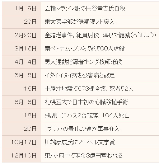 1968年クイズ 年クイズ 2024.09.082025.05.06 1968年クイズで振り返る「あのころ」は、その年の出来事、流行、政治・経済、スポーツ、ヒットしたアニメ、歌謡曲、映画などを題材にしたクイズを一気にすべてを出題します 1968年 出来事 1968年(昭和43年)に起きた出来事はどれ? 米軍が北ベトナム爆撃を開始 東京・府中で現金3億円奪われる ガガーリン氏、人類初の宇宙飛行 1968年 出来事 あなたの成績 {{maxScore}}問中 、{{userScore}}問正解 {{title}} {{image}} {{content}} 1968年(昭和43年)経済&物価 1.日経平均株価 / 為替レート(1米ドル=円)はどれ? 1,714.89 円 / 360.00 円 1,514.89 円 / 360.00 円 1,914.89 円 / 360.00 円 2.公衆浴場入浴料(大人)/ 都営地下鉄(初乗り料金)はどれ? 35 円 / 30 円 32 円 / 30 円 32 円 / 40 円 3.はがき1枚 / たばこ1箱(ハイライト) 7 円 / 80 円 10 円 / 100 円 10 円 / 80 円 4.ガソリン1リットル当たりの価格は? 267 円 287 円 247 円 1968年(昭和43年)経済&物価 あなたの成績 {{maxScore}}問中 、{{userScore}}問正解 {{title}} {{image}} {{content}} 1968年 日本国内ヒット映画 この年 1番ヒットした映画はどれ? 風林火山 連合艦隊司令長官 山本五十六 猿の惑星 卒業 1968年 日本国内ヒット映画 あなたの成績 {{maxScore}}問中 、{{userScore}}問正解 {{title}} {{image}} {{content}} 1968年(昭和43年)邦楽ヒット曲 この年のヒット曲はどれ?【4曲のうち、3曲は2年前のヒット曲】 星影のワルツ : 千昌夫 バラが咲いた : マイク真木 天使の誘惑 : 黛ジュン 恍惚のブルース : 青江三奈 1968年(昭和43年)邦楽ヒット曲 あなたの成績 {{maxScore}}問中 、{{userScore}}問正解 {{title}} {{image}} {{content}} 1968年(昭和43年)流行語 昭和43年の流行語は? トサカにくる/どーもすいません カラ出張/東京さばく グループ・サウンズ/五月病 いい線いってる/カワイコちゃん 1968年(昭和43年)流行語 あなたの成績 {{maxScore}}問中 、{{userScore}}問正解 {{title}} {{image}} {{content}} 1968年(昭和43年)おもちゃ(玩具) この年発売のヒット おもちゃはどれ? 人生ゲーム サンダーバード関連グッズ アポロ宇宙関連グッズ 巨人の星グッズ 1968年(昭和43年)おもちゃ(玩具) あなたの成績 {{maxScore}}問中 、{{userScore}}問正解 {{title}} {{image}} {{content}} 1968年(昭和43年)日本レコード大賞 1968年(昭和43年)第10回 日本レコード大賞は? 「天使の誘惑」黛ジュン 「三百六十五歩のマーチ」水前寺清子 「花の首飾り」タイガース 「ブルー・ライト・ヨコハマ」いしだあゆみ 1968年(昭和43年)日本レコード大賞 あなたの成績 {{maxScore}}問中 、{{userScore}}問正解 {{title}} {{image}} {{content}} 1968年(昭和43年)プロ野球 昭和43年 セリーグの優勝チームは? 大洋ホエールズ 読売ジャイアンツ サンケイアトムズ 中日ドラゴンズ 阪神タイガース 広島東洋カープ 昭和43年 パリーグの優勝チームは? 東京オリオンズ 阪急ブレーブス 東映フライヤーズ 西鉄ライオンズ 近鉄バファローズ 南海ホークス 1968年(昭和43年)プロ野球 あなたの成績 {{maxScore}}問中 、{{userScore}}問正解 {{title}} {{image}} {{content}} 1968年(昭和43年)春・夏の甲子園 昭和43年春の甲子園の優勝校は? 大宮工(埼玉) 尾道商(広島) 箕島高(和歌山) 倉敷工(岡山) 昭和43年夏の甲子園の優勝校は? 興国高(大阪) 興南高(沖縄) 倉敷工(岡山) 静岡商(静岡) 1968年(昭和43年)春・夏の甲子園 あなたの成績 {{maxScore}}問中 、{{userScore}}問正解 {{title}} {{image}} {{content}} 1968年 朝ドラ「あしたこそ」 人生の転機を持ち前の行動力で切り開く娘「香原摂子」を演じている女優はだれ? 細川ちか子 藤田弓子 中畑道子 藤間紫 1968年 朝ドラ「あしたこそ」 あなたの成績 {{maxScore}}問中 、{{userScore}}問正解 {{title}} {{image}} {{content}} 1968年大河ドラマ「竜馬がゆく」 主役「坂本竜馬」を演じている俳優はだれ? 小林桂樹 北大路欣也 津川雅彦 高橋英樹 1968年大河ドラマ「竜馬がゆく」 あなたの成績 {{maxScore}}問中 、{{userScore}}問正解 {{title}} {{image}} {{content}} 1968年(昭和43年)箱根駅伝競走 1968年新春 箱根駅伝(総合)の優勝大学は? 東洋大学 日本体育大学 順天堂大学 日本大学 1968年(昭和43年)箱根駅伝競走 あなたの成績 {{maxScore}}問中 、{{userScore}}問正解 {{title}} {{image}} {{content}} 1968年(昭和43年)高校サッカー 第47回大会 優勝校は? 広島工(広島) 初芝(大阪) 遠野(岩手) 山陽(広島) 1968年(昭和43年)高校サッカー あなたの成績 {{maxScore}}問中 、{{userScore}}問正解 {{title}} {{image}} {{content}} 1968年(昭和43年)夏季オリンピック この年 夏季オリンピックが開催された都市(国)は? ミュンヘン(西ドイツ) 東京(日本) メキシコシティ(メキシコ) メルボルン(オーストラリア) 1968年(昭和43年)夏季オリンピック あなたの成績 {{maxScore}}問中 、{{userScore}}問正解 {{title}} {{image}} {{content}} 1968年 赤ちゃん 1968年(昭和43年)生まれの赤ちゃん 名前1位は?(男の子) 哲也 剛 誠 健一 1968年(昭和43年)生まれの赤ちゃん 名前1位は?(女の子) 智子 由美子 直美 真由美 1968年 赤ちゃん あなたの成績 {{maxScore}}問中 、{{userScore}}問正解 {{title}} {{image}} {{content}} 1960年代 F9 1960年代に流行っていたファッションはどれ? 正解以外は他の年代 サブリナパンツ ミニスカート イッセイ・ミヤケ