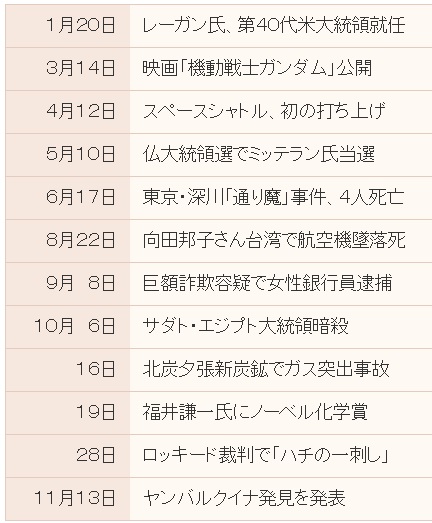 1984年クイズ 年クイズ 2024.09.082025.05.06 1984年クイズで振り返る「あのころ」は、その年の出来事、流行、政治・経済、スポーツ、ヒットしたアニメ、歌謡曲、映画などを題材にしたクイズを一気にすべてを出題します 1984年 出来事 1984年(昭和59年)に起きた出来事はどれ? 江崎グリコ社長誘拐 北海道の有珠山が噴火 スペースシャトル、初の打ち上げ 1984年 出来事 あなたの成績 {{maxScore}}問中 、{{userScore}}問正解 {{title}} {{image}} {{content}} 1984年(昭和59年)経済&物価 1.日経平均株価 / 為替レート(1米ドル=円)はどれ? 11,452.60 円 / 247.78 円 10,452.60 円 / 227.78 円 12,452.60 円 / 267.78 円 2.公衆浴場入浴料(大人)/ 都営地下鉄(初乗り料金)はどれ? 250 円 / 140 円 240 円 / 140 円 250 円 / 120 円 3.はがき1枚 / たばこ1箱(セブンスター) 40 円 / 200 円 40 円 / 220 円 41 円 / 200 円 4.ガソリン1リットル当たりの価格は? 161 円 201 円 181 円 5.新規大学卒 / 高校卒(男子)の初任給は? 125,800 円 / 98,800 円 145,800 円 / 118,800 円 135,800 円 / 108,800 円 1984年(昭和59年)経済&物価 あなたの成績 {{maxScore}}問中 、{{userScore}}問正解 {{title}} {{image}} {{content}} 1984年 日本国内ヒット映画 この年 1番ヒットした映画はどれ? 里見八犬伝 インディ・ジョーンズ 魔宮の伝説 キャノンボール2 メインテーマ/愛情物語 1984年 日本国内ヒット映画 あなたの成績 {{maxScore}}問中 、{{userScore}}問正解 {{title}} {{image}} {{content}} 1984年(昭和59年)邦楽ヒット曲 この年のヒット曲はどれ?【4曲のうち、3曲は2年前のヒット曲】 心の色 : 中村雅俊 もしも明日が…。 : わらべ 聖母たちのララバイ : 岩崎宏美 セーラー服と機関銃 : 薬師丸ひろ子 1984年(昭和59年)邦楽ヒット曲 あなたの成績 {{maxScore}}問中 、{{userScore}}問正解 {{title}} {{image}} {{content}} 1984年(昭和59年)新語・流行語 昭和59年の新語・流行語は? ファミコン /バクハツだ! JR /ワンフィンガー ツーフィンガー パフォーマンス/私はコレで会社をやめました オシンドローム /○金・○ビ(まるきん・まるび) 1984年(昭和59年)新語・流行語 あなたの成績 {{maxScore}}問中 、{{userScore}}問正解 {{title}} {{image}} {{content}} 1984年(昭和59年)おもちゃ(玩具) この年発売のヒット おもちゃ等はどれ? チクタクバンバン ジャンケンマン ムーニーちゃんプクプクハウス 電撃戦隊チェンジマン 1984年(昭和59年)おもちゃ(玩具) あなたの成績 {{maxScore}}問中 、{{userScore}}問正解 {{title}} {{image}} {{content}} 1984年(昭和59年)日本レコード大賞 1984年(昭和59年)第26回 日本レコード大賞は? 「Rock'n Rouge」松田聖子 「ワインレッドの心」安全地帯 「長良川艶歌」五木ひろし 「もしも明日が…。」わらべ 1984年(昭和59年)日本レコード大賞 あなたの成績 {{maxScore}}問中 、{{userScore}}問正解 {{title}} {{image}} {{content}} 1984年(昭和59年)プロ野球 昭和59年 セリーグの優勝チームは? ヤクルトスワローズ 阪神タイガース 広島東洋カープ 横浜大洋ホエールズ 中日ドラゴンズ 読売ジャイアンツ 昭和59年 パリーグの優勝チームは? 西武ライオンズ 南海ホークス 近鉄バファローズ 阪急ブレーブス ロッテ・オリオンズ 日本ハム・ファイターズ 1984年(昭和59年)プロ野球 あなたの成績 {{maxScore}}問中 、{{userScore}}問正解 {{title}} {{image}} {{content}} 1984年(昭和59年)春・夏の甲子園 昭和59年春の甲子園の優勝校は? PL学園高(大阪) 大船渡高(岩手) 都城高(宮崎) 岩倉高(東京) 昭和59年夏の甲子園の優勝校は? 鎮西高(熊本) 金足農(秋田) 取手二高(茨城) PL学園高(大阪) 1984年(昭和59年)春・夏の甲子園 あなたの成績 {{maxScore}}問中 、{{userScore}}問正解 {{title}} {{image}} {{content}} 1984年 朝ドラ「ロマンス」 大正から昭和の初めにかけて、映像文化の誕生に情熱を注いだ青年「加治山平七」を演じている俳優はだれ? 榎木孝明 辰巳琢郎 岡田真澄 前田吟 1984年 朝ドラ「ロマンス」 あなたの成績 {{maxScore}}問中 、{{userScore}}問正解 {{title}} {{image}} {{content}} 1984年 朝ドラ「心はいつもラムネ色」 戦前戦後の大阪を舞台に、漫才を大衆芸能の覇者に育て上げた漫才作家をモデルにした「赤津文平」を演じている俳優はだれ? 新藤栄作 柴田恭兵 美木良介 岸部一徳 1984年 朝ドラ「心はいつもラムネ色」 あなたの成績 {{maxScore}}問中 、{{userScore}}問正解 {{title}} {{image}} {{content}} 1984年大河ドラマ「山河燃ゆ」 日系二世「天羽賢治」を演じている俳優はだれ? 西田敏行 松本幸四郎 沢田研二 児玉清 1984年大河ドラマ「山河燃ゆ」 あなたの成績 {{maxScore}}問中 、{{userScore}}問正解 {{title}} {{image}} {{content}} 1984年(昭和59年)箱根駅伝競走 1984年新春 箱根駅伝(総合)の優勝大学は? 順天堂大学 日本体育大学 大東文化大学 早稲田大学 1984年(昭和59年)箱根駅伝競走 あなたの成績 {{maxScore}}問中 、{{userScore}}問正解 {{title}} {{image}} {{content}} 1984年(昭和59年)高校サッカー 第63回大会 優勝校は? 藤枝東(静岡) 帝京(東京) 島原商(長崎) 武南(埼玉) 1984年(昭和59年)高校サッカー あなたの成績 {{maxScore}}問中 、{{userScore}}問正解 {{title}} {{image}} {{content}} 1984年(昭和59年)夏季オリンピック この年 夏季オリンピックが開催された都市(国)は? モスクワ(ソビエト連