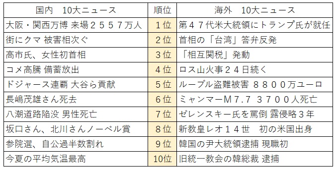 出来事2025年(令和7年) 2025年(令和7年) 2025.12.312025年 この年に起きた日本・海外での出来事(ニュース)はどれ? 2025年 出来事 2025年(令和7年)に起きた出来事はどれ? サッカーW杯で日本代表熱戦 大阪・関西万博 来場2557万人 自民党総裁に石破氏、首相に就任2025年 出来事あなたの成績 {{maxScore}}問中 、{{userScore}}問正解{{title}}{{image}}{{content}}